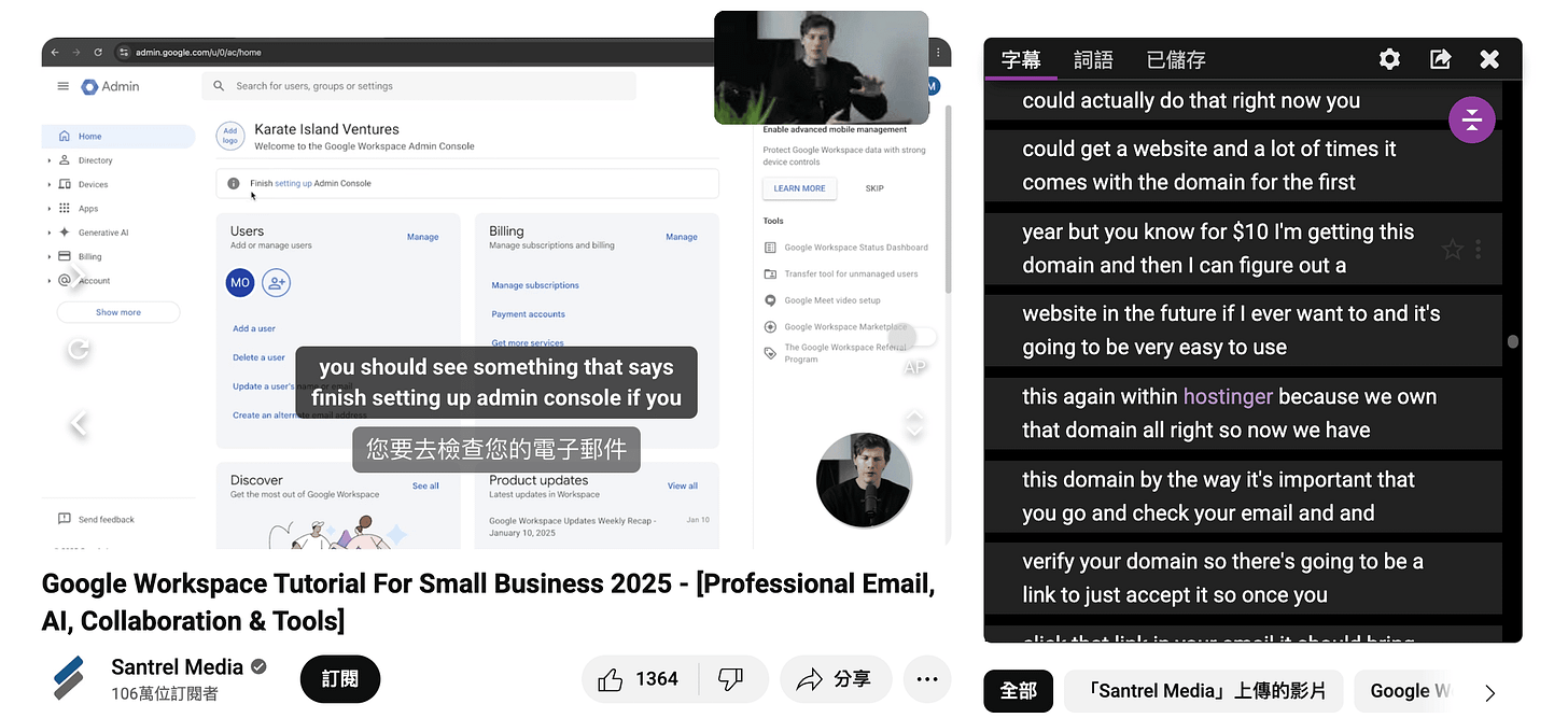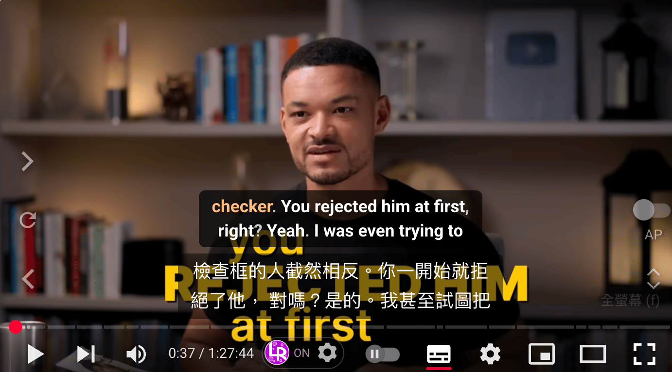 接著,當你打開youtube,看英文影片時,只要這些影片有上傳原始的英文字幕檔,那LR外掛就會提供你雙語字幕,右側也會有原文字幕同步供你對照。
