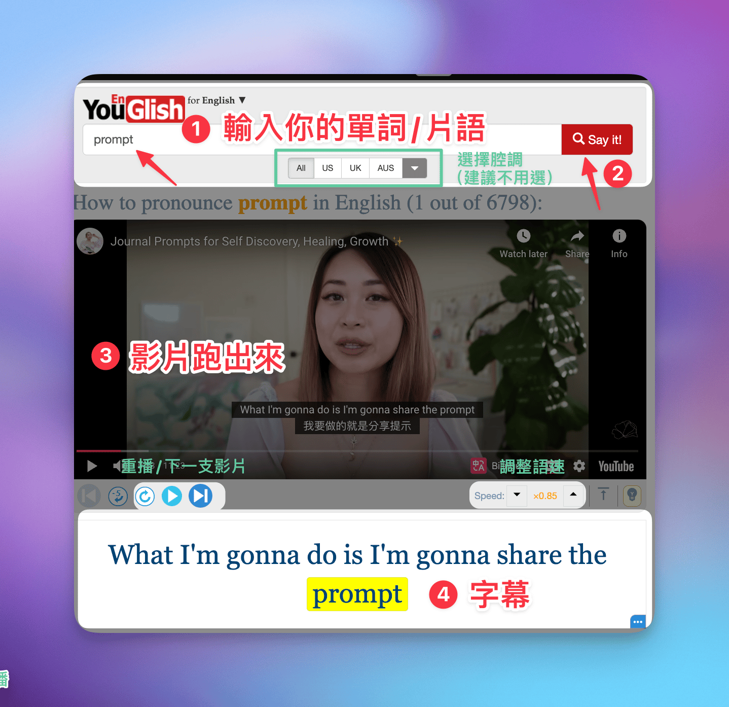 這個影片庫就會幫你篩出有提到這個單字/詞組的影片。你可以透過慢速+反覆播放,來模仿這個字的發音。