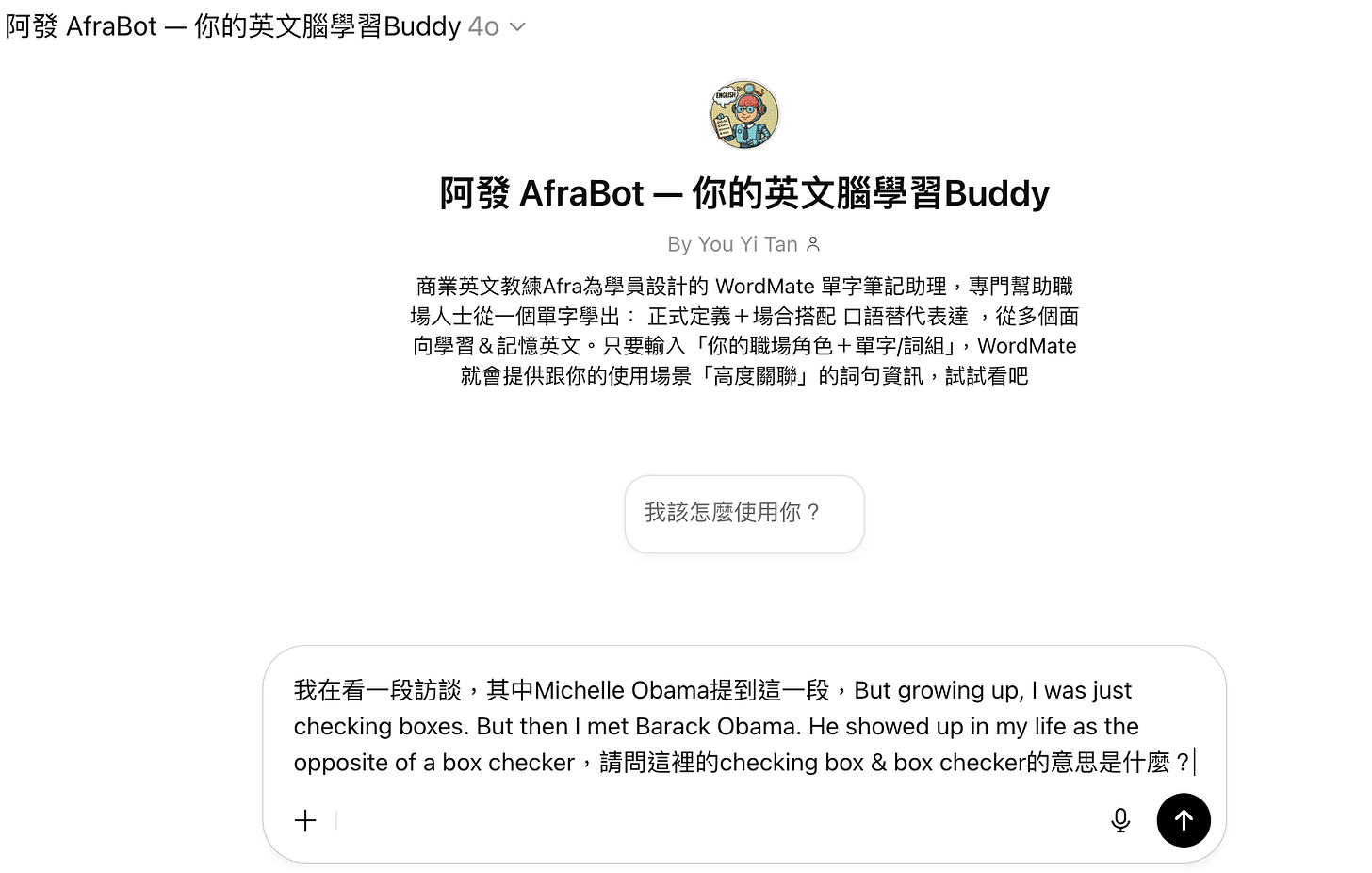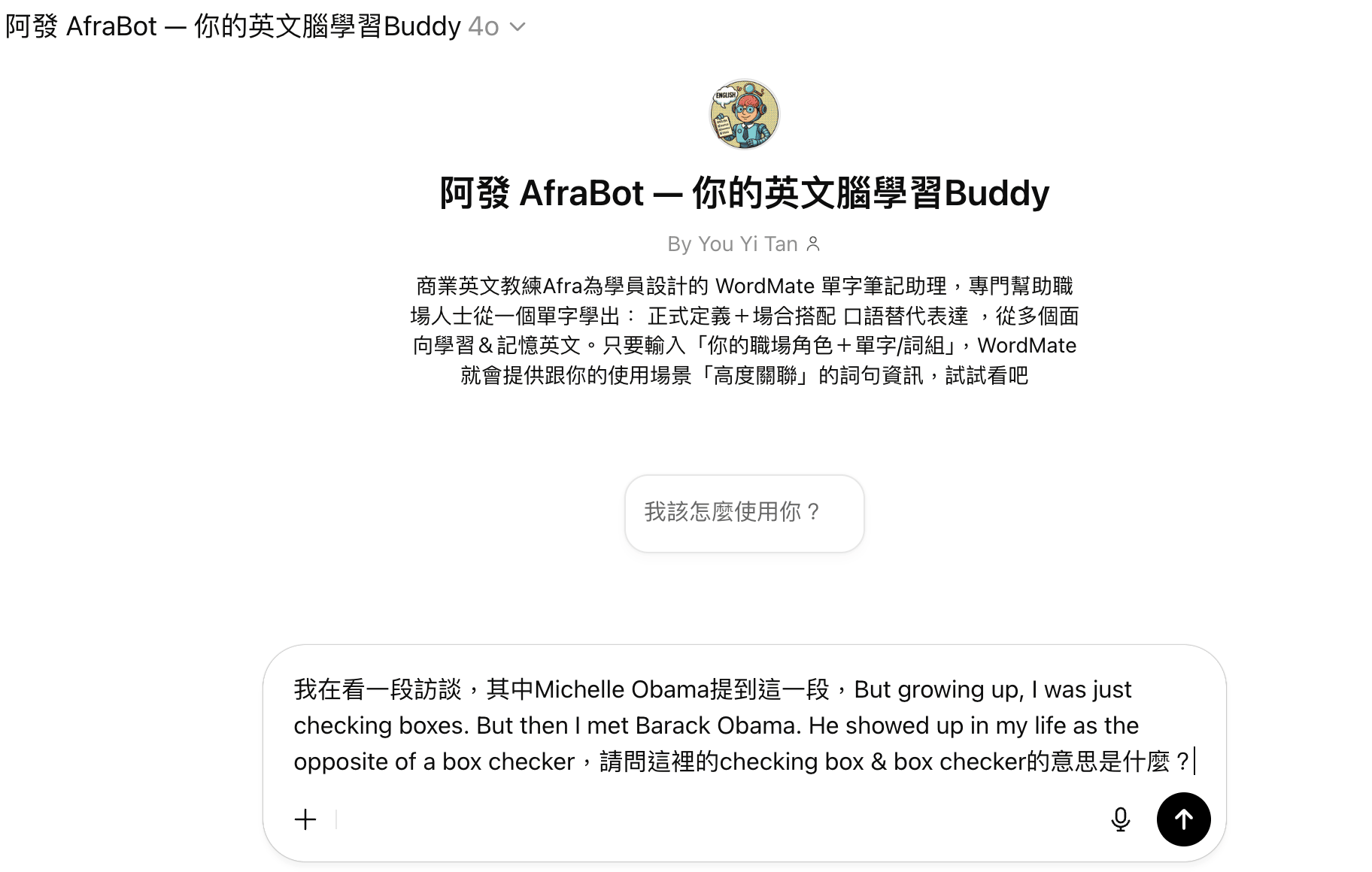 *如果你還沒聽過我分享我怎麼用ChatGPT查單字,以及取得我的阿發AfraBot單字筆記助手,記得回看這部影片👇